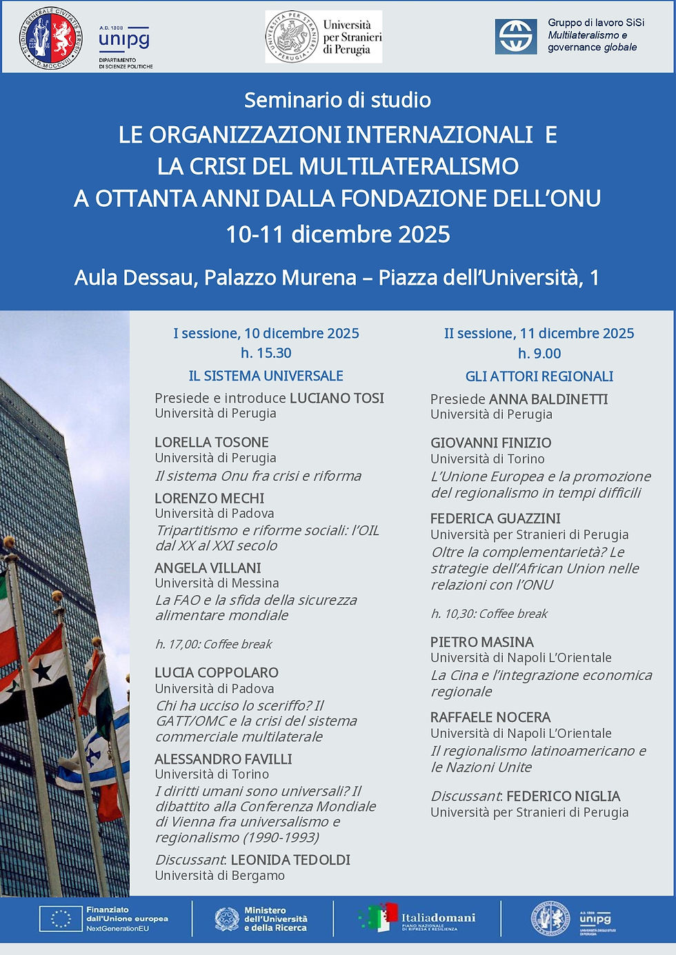 Si segnala il seminario di studio Le Organizzazioni internazionali e la crisi del multilateralismo a ottanta anni dalla fondazione dell’Onu, che si terrà il 10 e 11 dicembre 2025 presso l’Università di Perugia (Aula Dessau, Palazzo Murena – Piazza dell’Università, 1).